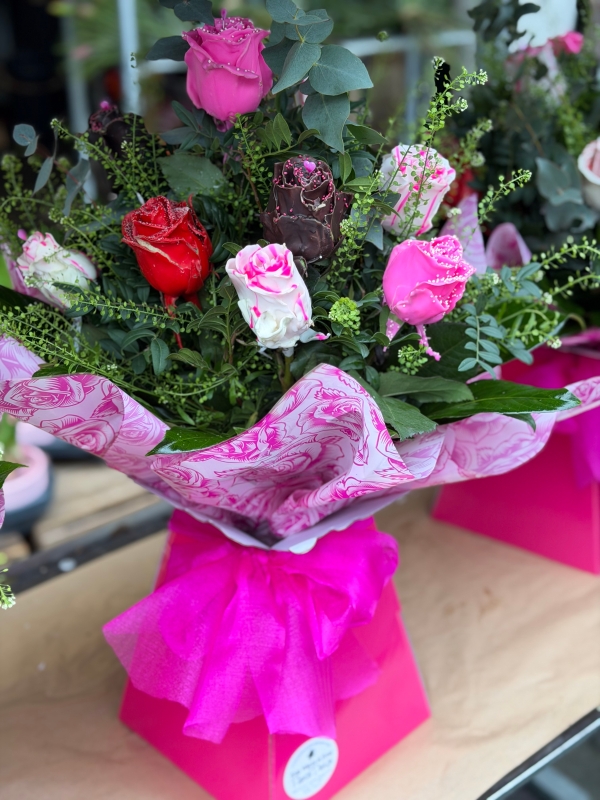 A dozen dipped wax roses hand tied in water ... available in Frosted Red or Chocolate Box. Nicely scented and the perfect valentines gift for your loved one.